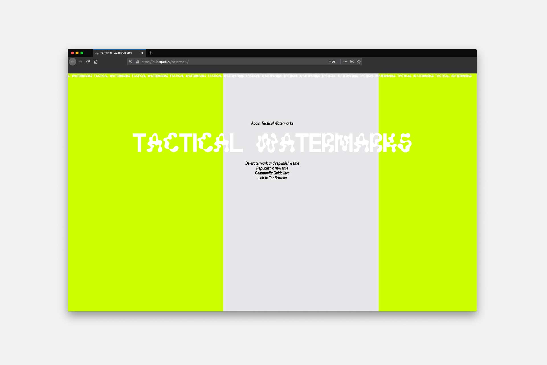 Tactical Watermarks is a counter-strategy against closed-access publishing and an alternative form of anonymization. It is a free, open-source online republishing platform that I developed using Flask, hosted on two Raspberry Pis, and accessible through both the clear web and Tor. Tactical Watermarks makes use of digital watermarks to question authorship, protect users’ identities, and subvert surveillance in both physical and digital media.