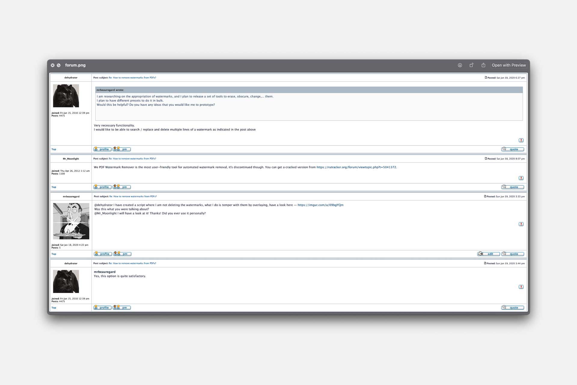 Library Genesis titles are often watermarked. While participating in this library's forum, I discovered a thread titled “How to remove watermarks from PDFs?”. Through interviews with forum members, I identified the need for a tool to anonymize library records. Existing software to remove watermarks was either proprietary and ironically restricted, or ineffective.