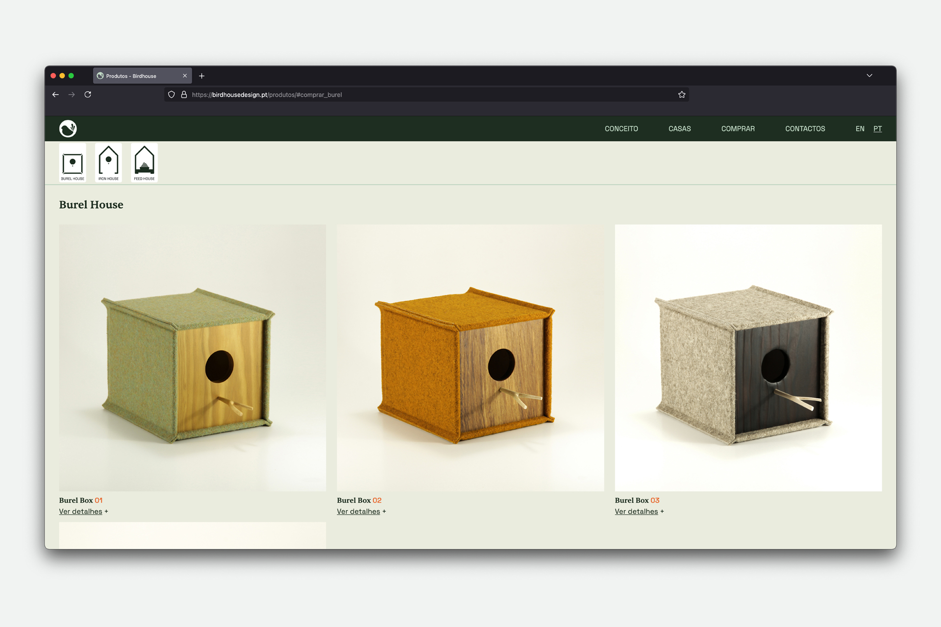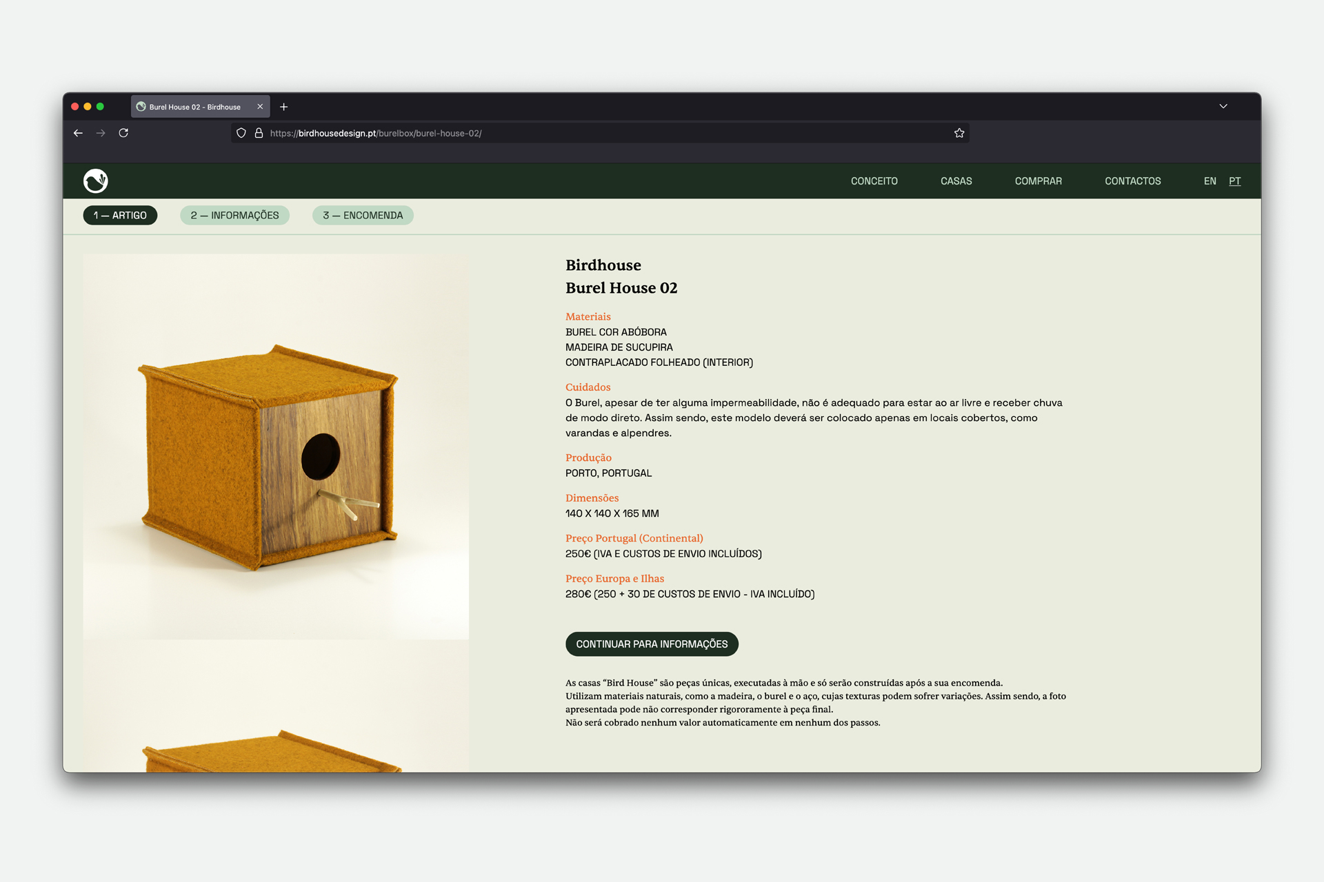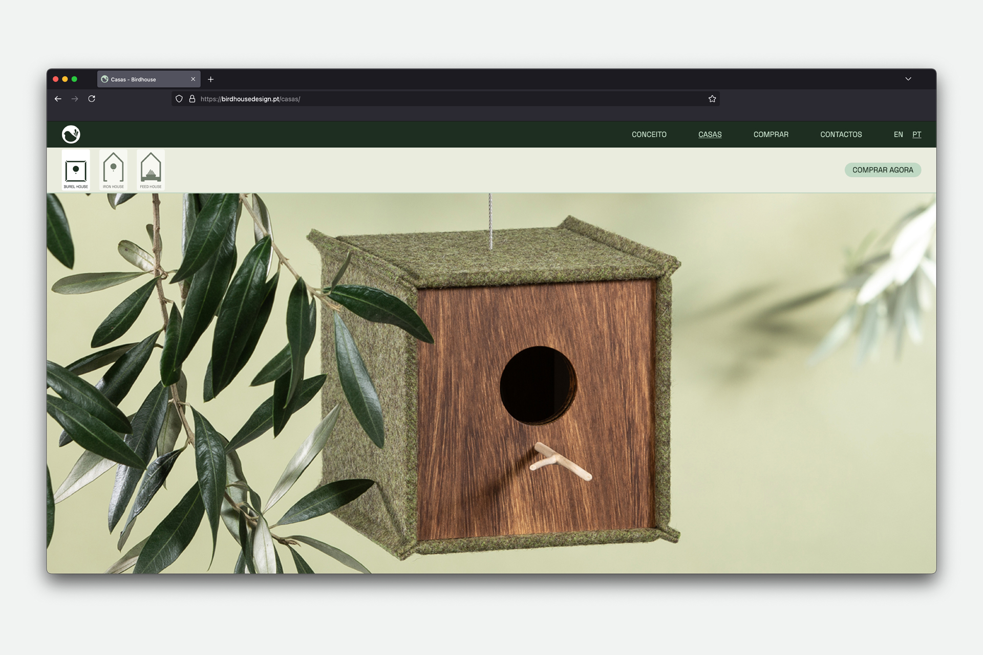 All Bird Houses are handmade, one-of-a-kind, built to order. They blend the natural beauty of wood, Burel (a traditional Portuguese wool textile), steel, and high-temperature glazed ceramic. Each Bird House is unique. The challenge was to create a website that would not only showcase these exclusive pieces but also facilitate a buying process that reflects the singularity of each piece.